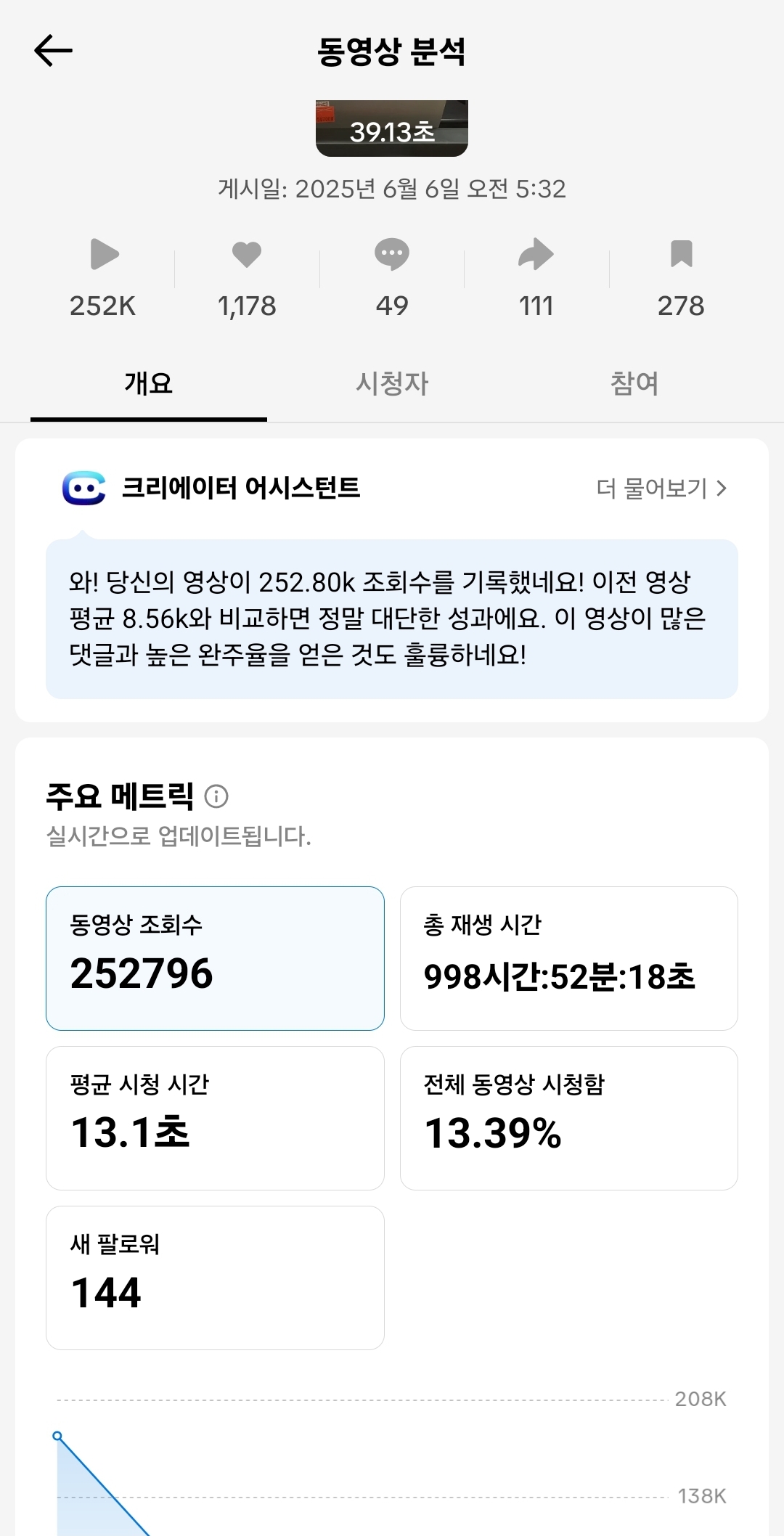 지난 금요일 올린 40초짜리 영상이 총재생 시간 1000시간에 가까워졌습니다.